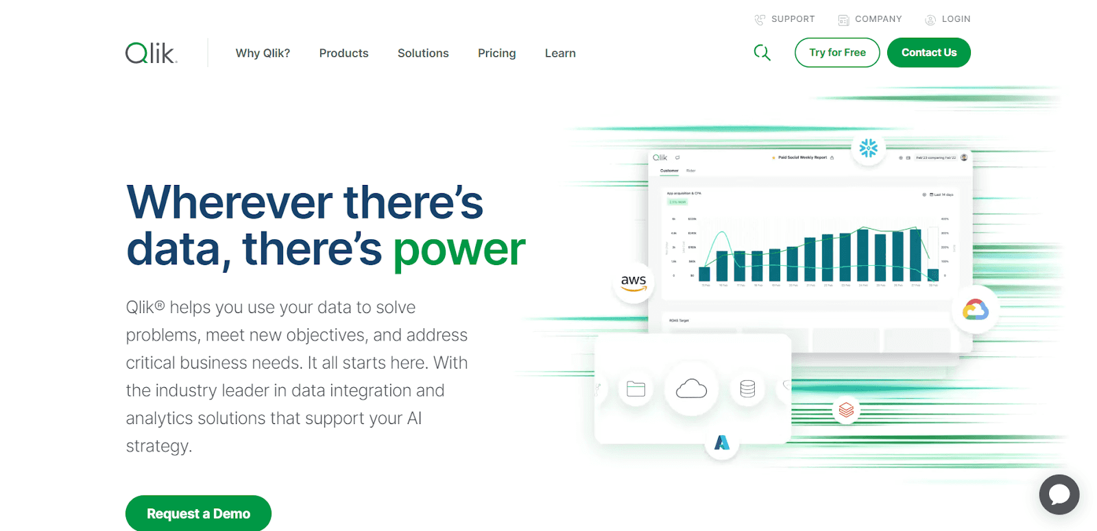 Qlik is another amazing AI tool designed to help data analysts make sense of their data. Similar to Tableau, it offers multiple tools under the same name, each with its own use during the data analysis process. Thus, it's designed to support each step of your journey, whether it's data integration, transformation, or analysis, to achieve positive outcomes.