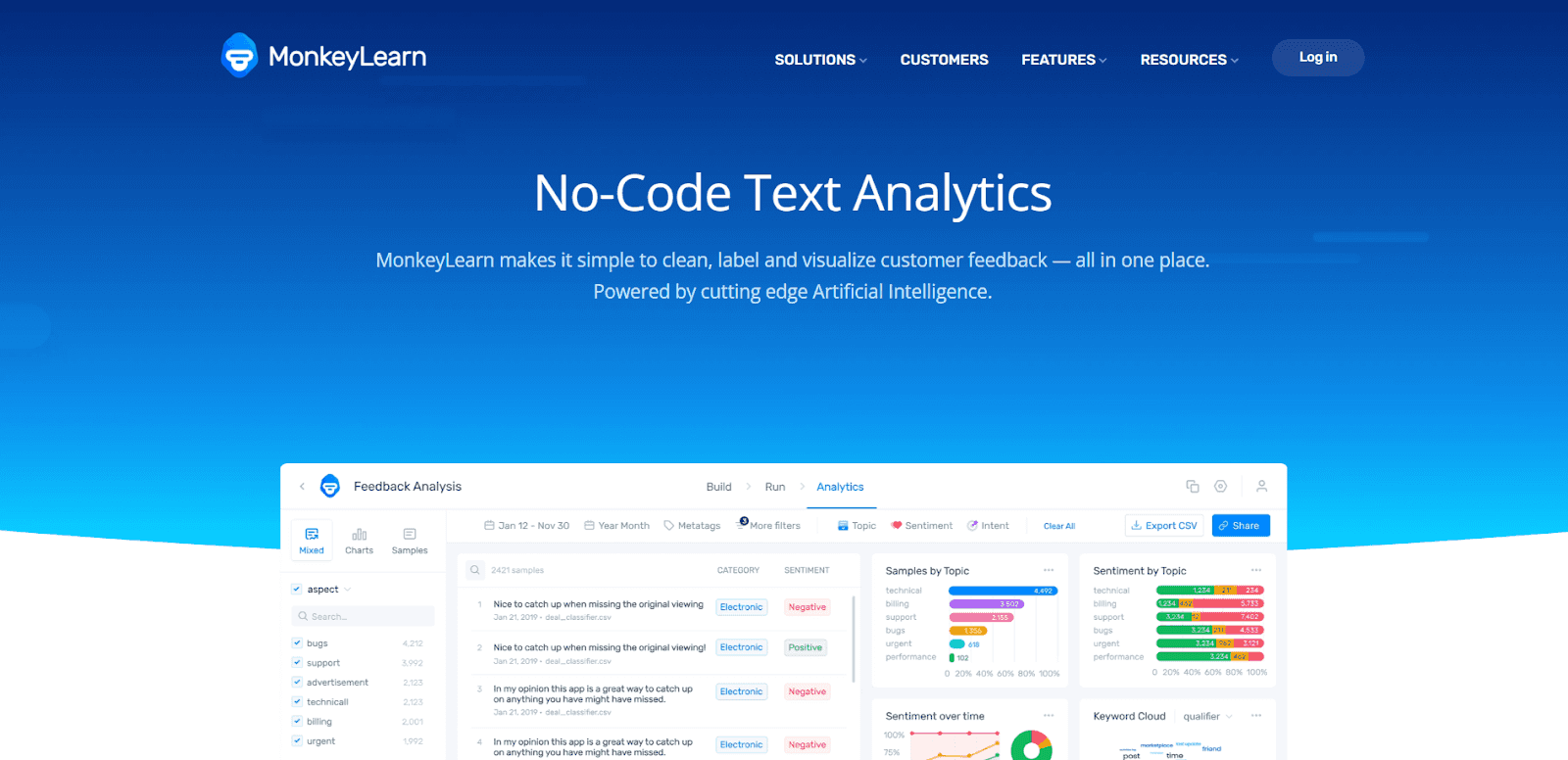 Another AI-powered platform you can look into is MonkeyLearn. This data analysis AI tool specializes in no-code text analytics and can be used to clean, label, and visualize customer feedback. Besides interpreting text and data, it can also extract insights from your unstructured text and rearrange its data.