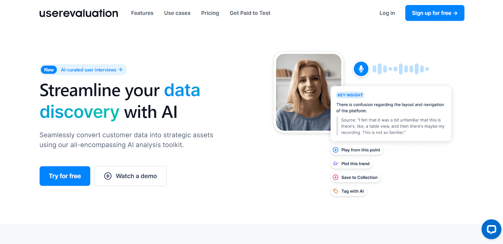 One of the best AI data analysis tools we recommend you to try out is User Evaluation. This platform acts as an all-in-one AI tool for fast and efficient customer research. It's designed to help businesses uncover valuable user insights with the help of an automated data analysis process.